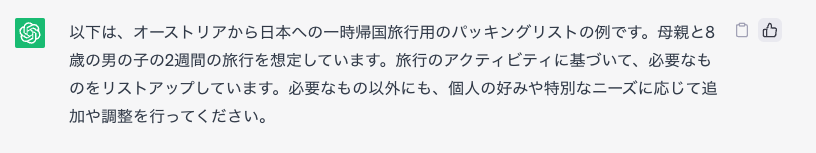 7月にうちのチビ(8才)と2週間ほど日本に帰るので、ChatGPTにパッキングリスを作ってもらいました⬇︎ 自分で作るよりもモレがない❗️🤣